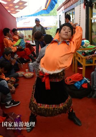 8月3日,在西藏堆龍德慶縣乃瓊鎮(zhèn),覺木隆藏戲團(tuán)演員次珍在望果節(jié)演出前練習(xí)。