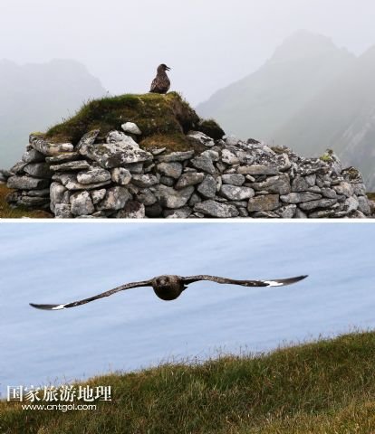 上圖,一只大賊鷗把當年村民的儲物石屋當作了自己的巢穴(7月19日攝)。圣基爾達島上散布著數(shù)百個石頭壘砌,草皮作頂?shù)膬ξ锸?,用來保存村民獵取的鳥類和用途燃料的泥炭。下圖,一只大賊鷗直飛過來,襲擊靠近它的巢穴的記者(7月19日攝)。