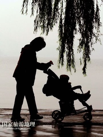 11月4日,一位市民推著童車(chē)在西湖岸邊游玩。