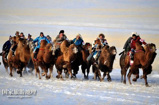 國家旅游地理 內(nèi)蒙古錫林郭勒1月5日訊 1月5日,牧民們?cè)?0公里駱駝速度賽比賽中。當(dāng)日,內(nèi)蒙古烏珠穆沁駱駝文化節(jié)在西烏珠穆沁旗烏蘭哈拉嘎蘇木舉行。來自呼倫貝爾、鄂爾多斯以及蘇尼特和烏珠穆沁草原的牧民帶著200多峰駱駝在白雪皚皚的草原上進(jìn)行駱駝選美、10公里駱駝速度賽等以比賽活動(dòng)和民俗風(fēng)情表演,展示內(nèi)蒙古草原上獨(dú)特的駱駝文化。 /新華社記者 任軍川 攝