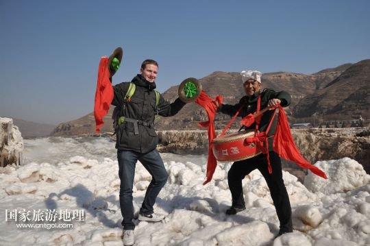 國家旅游地理 陜西延安1月26日訊 1月25日,一名游客在黃河壺口瀑布景區(qū)與民俗演員合影留念。當(dāng)日,受凌汛影響一度關(guān)閉的黃河壺口瀑布景區(qū)重新開放迎賓,游客可近距離欣賞“冰瀑玉壺”的壯麗景觀。 /新華社發(fā)(呂桂明 攝)