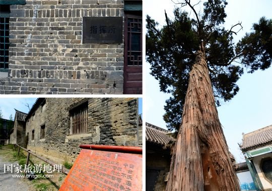 位于臺(tái)兒莊古城的臺(tái)兒莊大戰(zhàn)指揮所(左上)、民居(左下)和清真寺內(nèi)柏樹(shù)(右)上,仍保存著當(dāng)年臺(tái)兒莊大戰(zhàn)中留下來(lái)的彈孔(拼版照片,4月8日攝)。