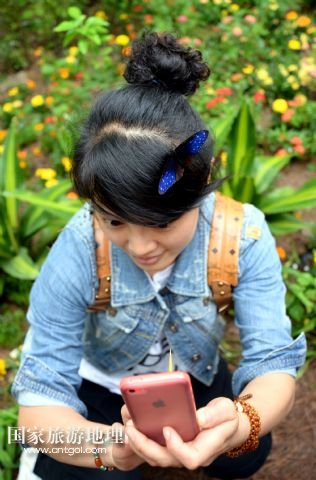4月27日,游客在“蝴蝶谷”用手機(jī)拍攝落在頭上的蝴蝶。