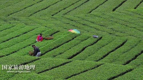 4月27日,兩位老人在村里茶園中采茶。