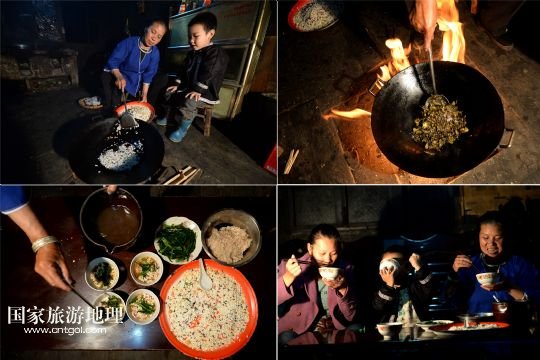 5月14日晚飯過后,高友村民在家里制作、品嘗當(dāng)?shù)貍鹘y(tǒng)美食糯米韭菜油茶(拼版照片)。