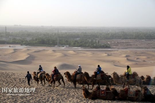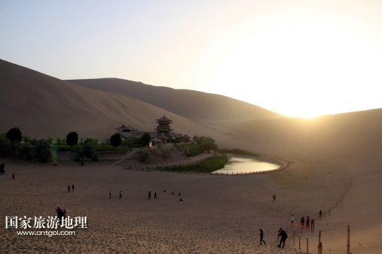 國(guó)家旅游地理 甘肅酒泉5月19日訊 夕陽(yáng)下的甘肅省敦煌市鳴沙山月牙泉顯得更加迷人(5月18日攝)。初夏時(shí)節(jié),甘肅省敦煌市鳴沙山月牙泉景區(qū)風(fēng)光秀美,吸引眾多中外游客前來(lái)觀光游覽。 新華社發(fā)(張曉亮 攝)