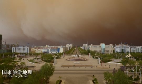 國(guó)家旅游地理 甘肅玉門5月23日訊 5月23日,在甘肅玉門市,突如其來(lái)的沙塵籠罩了整個(gè)城市。當(dāng)日上午,受新疆低槽冷空氣的影響,甘肅玉門境內(nèi)天空出現(xiàn)罕見(jiàn)的云層奇景和沙塵天氣,原本非常晴朗的藍(lán)天,霎時(shí)天昏地暗,同時(shí)伴有6至7級(jí)西風(fēng),能見(jiàn)度只有500米。新華社發(fā)(楊旭升 宋常青 攝)