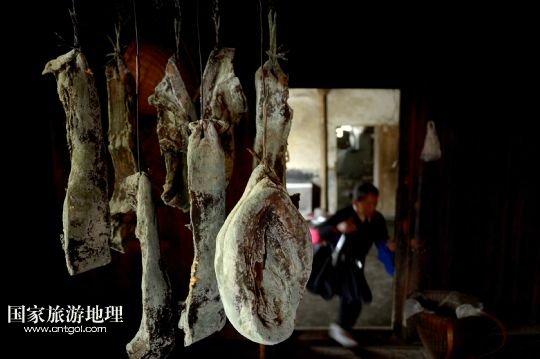 一戶板寮村農家的屋中掛著當地的傳統食品——臘肉(5月22日攝)。