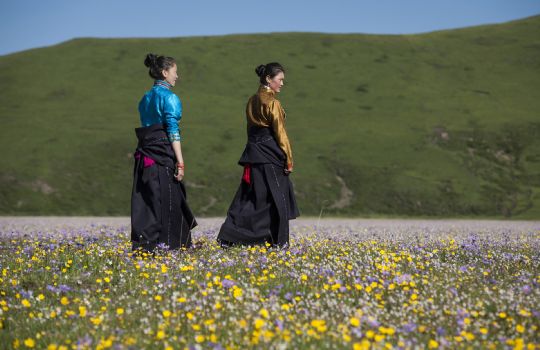 6月19日,兩位藏族姑娘徜徉在俄木塘草原花海中。