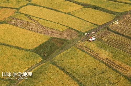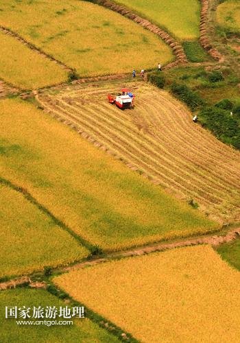 國(guó)家旅游地理 江蘇淮安9月27日訊 這是9月26日航拍的江蘇省淮安市盱眙縣鮑集鎮(zhèn)稻田收獲圖景。近期,江蘇省各地的水稻產(chǎn)區(qū)陸續(xù)開(kāi)鐮收割。收割機(jī)踏著大地的指紋收獲金黃的稻谷,繪就一幅幅美麗的豐收?qǐng)D畫。新華社發(fā)(周海軍 攝)
