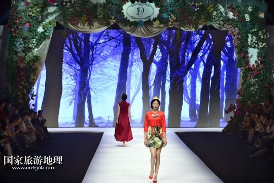 5月9日,模特在“2015杭州國際時尚周”開幕式上展示英國寶萊達(dá)服裝設(shè)計(jì)公司主題為“樹靈派對”的時裝。