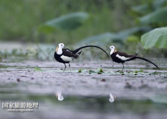 國家旅游地理 江西九江5月31日訊 5月29日,兩只水雉在江西省九江市賽城湖濕地嬉戲。入夏以來,數(shù)十只漂亮的水雉飛抵江西九江市賽城湖濕地,湖區(qū)良好的生態(tài)為水雉提供了舒適的棲息環(huán)境。水雉體態(tài)優(yōu)美,羽色艷麗,輕步行走于睡蓮、荷葉等浮葉植物上,有“凌波仙子”的美名。/新華社發(fā)(沈俊峰 攝)