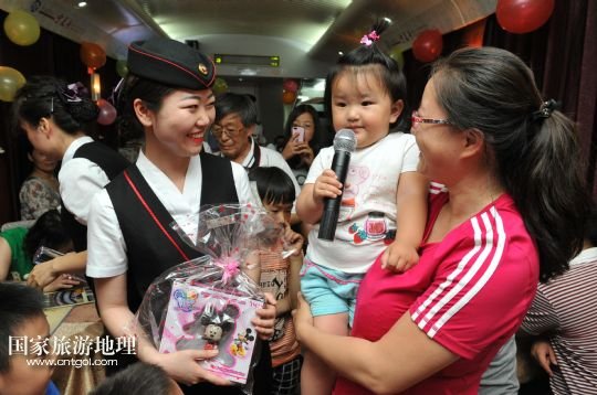 國(guó)家旅游地理 寧夏銀川6月1日訊 5月31日晚上,蘭州鐵路局銀川客運(yùn)段寧夏號(hào)列車上的一線乘務(wù)人員為乘坐列車的孩子們舉辦了一場(chǎng)“歡慶六一”迷你晚會(huì),通過(guò)才藝展示和贈(zèng)送小禮品,讓旅途中的孩子們感受到溫暖和歡樂(lè)。新華社記者 彭昭之 攝