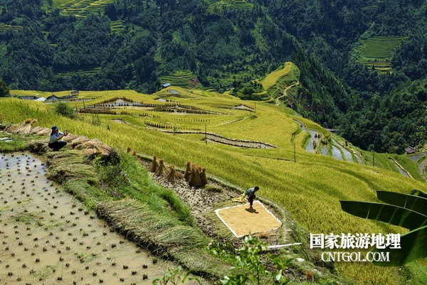 在陽(yáng)光照耀下,層層疊疊的梯田從山腳盤繞到山腰,放眼望去,金燦燦的梯田布滿山間,層層梯田,連綿起伏,拾級(jí)而上,金黃燦爛,小山如螺,大山似塔,高低錯(cuò)落。蜿蜒如春螺、披嵐似云塔,秀美如畫。