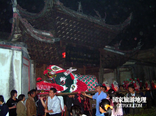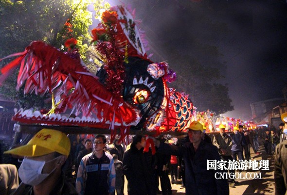 2月18日入夜,春雨霏霏。在光裕堂祖祠祭龍頭畢,鄒姓村民紛紛肩抬慶燈到祖祠接成220多米長(zhǎng)的“龍”身。三聲銃響,游龍時(shí)而在村間慢悠游弋,時(shí)而在村道滯拔狂走,火紅的燭光伴著霏霏春雨,讓慶燈“龍”絢麗多姿,展示了“紙包火”的奇跡。 游“龍”所經(jīng)之處,鞭炮和禮花聲不絕于耳,祈求五谷豐登、吉祥如意。街巷人山人海,熱鬧非凡,一派花燈游龍慶豐收狂歡鬧元宵盛況。 吸引了海內(nèi)外游客及四鄰八鄉(xiāng)的萬余群眾紛紛前往觀看。